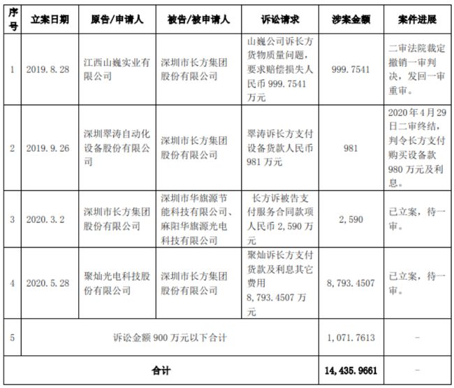 不过长方集团拖欠货款并非此一家。仅近1年时间,公司作为被告的诉讼金额为1.1亿元,既有深圳翠涛自动化设备向其讨要981万货款,也有江西山巍实业诉其货物质量问题,要求赔偿千万元。