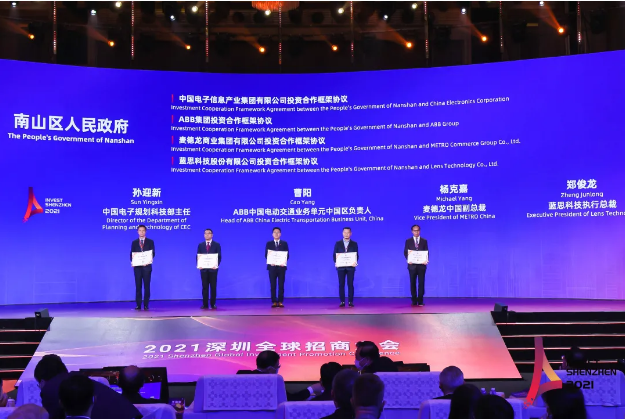 南山区共报送31个项目,涉及投资总额超1000亿元;中国电子总部、瑞士ABB电动交通中国总部、蓝思科技国际总部、德国麦德龙南方总部项目现场签约,涉及总投资额441亿元;中航国际、招商局集团、开域国际获评优秀落户企业。