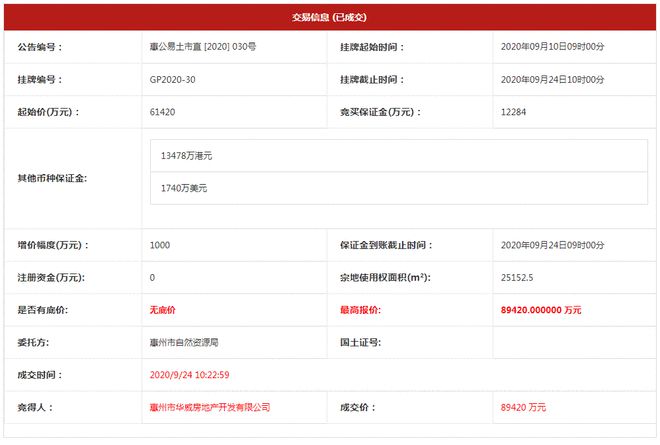 惠州市华威房地产开发有限公司以89420万元竞得惠州市江北三新村商住用地,宗地计算指标用地面积38290.68㎡,规划建筑总面积114873㎡,折合楼面价7784元/㎡,溢价46%。