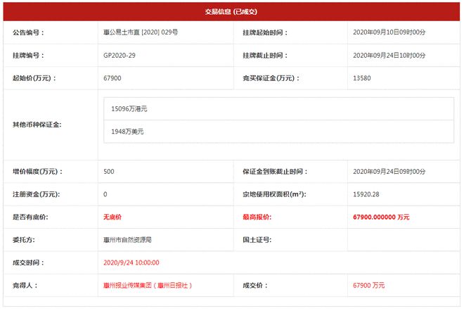 惠州报业传媒集团(惠州日报社)以67900万元竞得惠州市江北三新村商服用地,宗地计算指标用地面积20000.28㎡,规划建筑总面积45200㎡,折合楼面价15022元/㎡。