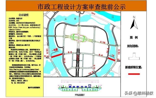另外,根据8月31日惠州市惠城区自然资源局发布《惠州市交通运输局直属分局地方公路站市政工程设计方案审查批前公示》。金山湖片区将规划建设2座桥,其中一条是连接横一路与翠竹一路的金山湖二号桥。
