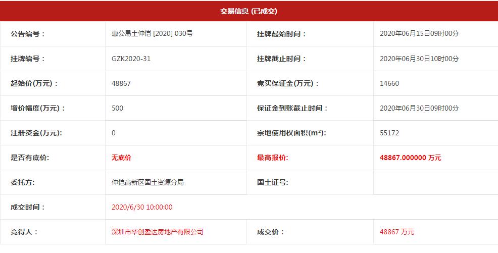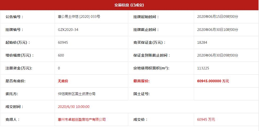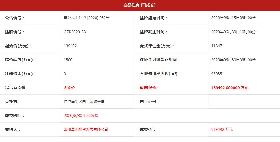 地块编号惠公易土仲恺[2020]033号,挂牌编号GZK2020-34,宗地使用权总面积113225㎡,土地使用权出让年限住宅七十年,商服四十年,工业(M0)四十年,物流仓储五十年,计容积率建筑面积≤199424㎡(其中商服建筑面积≤44870㎡),容积率≤4.0,建筑密度<38%,绿地率≥25%,起始价6.09亿元。