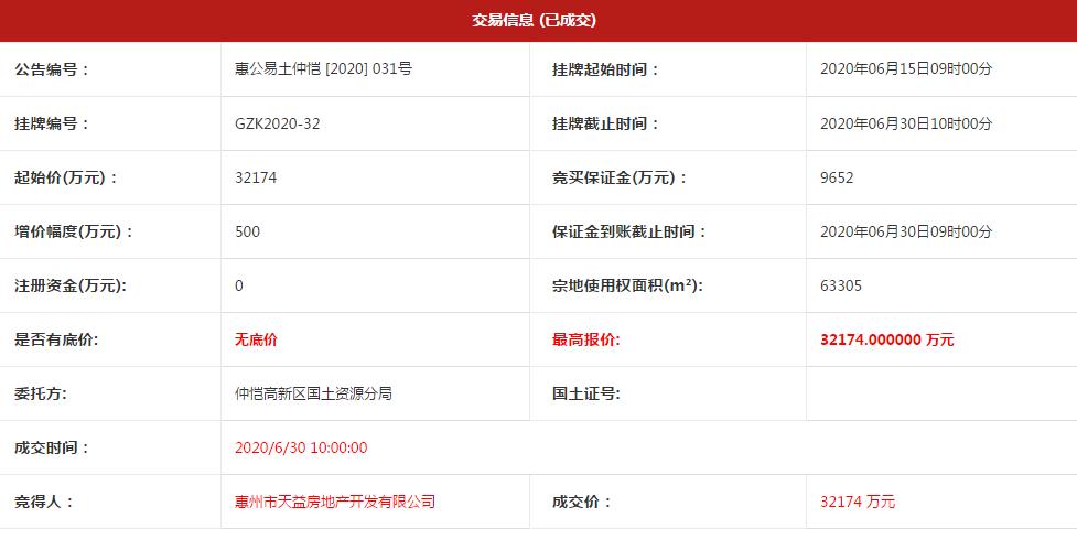 地块编号惠公易土仲恺[2020]031号,地块位于仲恺大道旁,地块规划编号ZKB-048-05、ZKB-048-06、ZKB-048-03-01,用地面积1.12万平,计容积率建筑面积≤44640平,容积率≤4.0,建筑密度<45%,绿地率≥25%,起始价3.22亿元。