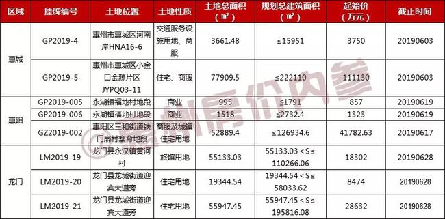 惠阳区共有3宗地块挂牌,两宗为商业地块,位于永湖镇福地村,地块面积都不大,另一宗位于三和街道,为商服及城镇住宅用地。