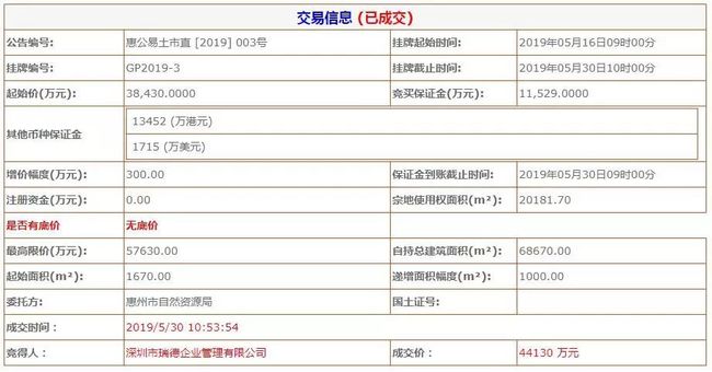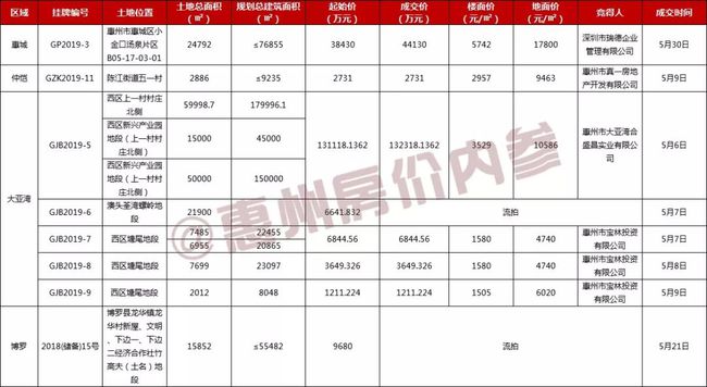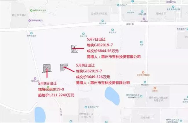 5月7日—5月9日,惠州大亚湾西区塘尾地段三宗相邻地块连续三日挂牌出售,并被惠州市宝林投资有限公司收入囊中。
