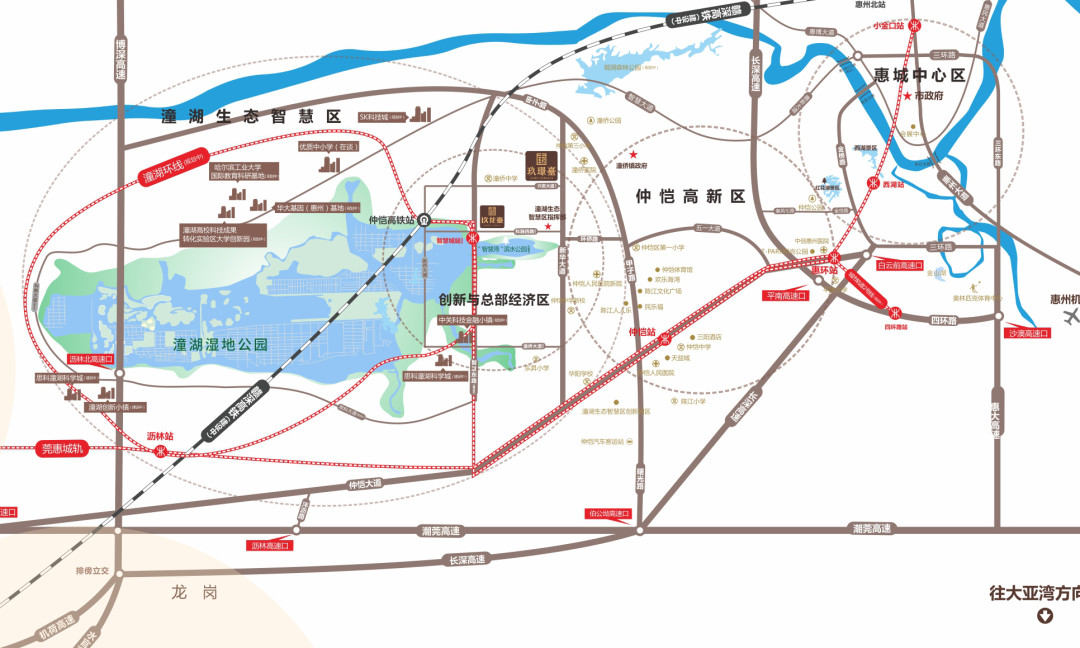 龙光 玖璟台地处仲恺高新区,紧邻潼湖生态智慧区,位据城市关键核芯,优享“1机场1高铁4城轨4高速3干道”立体交通全覆盖,深莞广畅达无阻。
