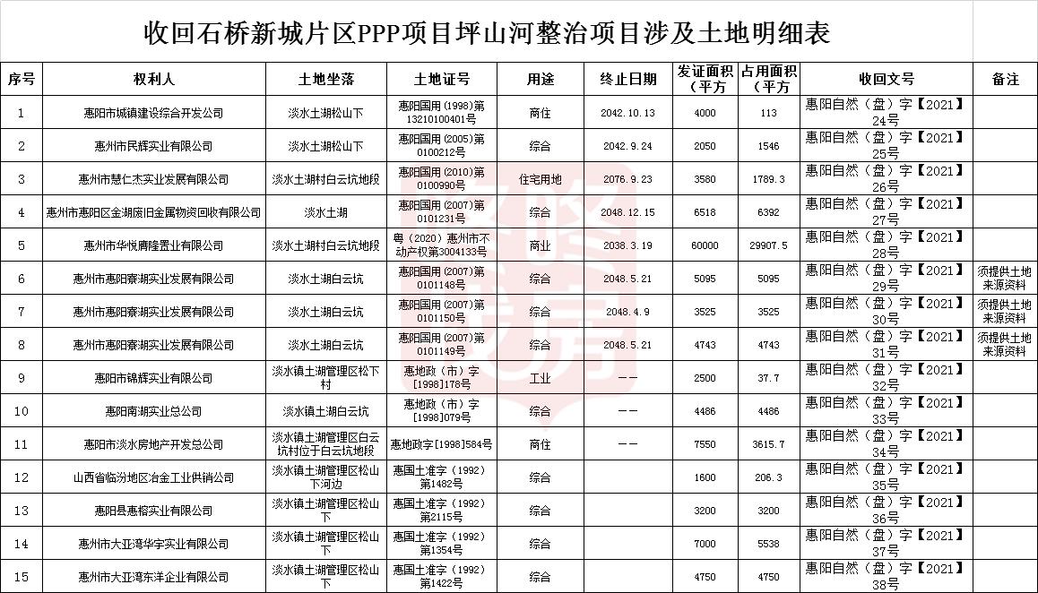 该收回土地明细表显示,共涉及惠州市华悦膺隆置业有限公司、惠州市惠阳寮湖实业发展有限公司、惠州市大亚湾华宇实业有限公司等12家公司15宗土地。