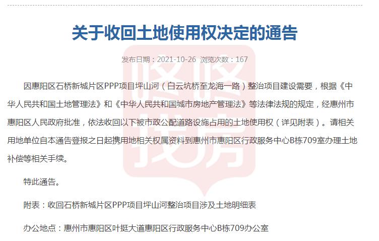 因惠阳区石桥新城片区PPP项目坪山河(白云坑桥至龙海一路)整治项目建设需要,依法收回以下被市政公配道路设施占用的土地使用权(详见附表)。