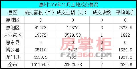 11月惠州土地市场延续10月的低迷状态,据房掌柜统计,11月全市仅7宗商业或商住用地成功出售,交易总面积为101104.5平米,交易总金额为20520.58万元。其中,位于龙门县的一宗商服地出现溢价情况,其余地块均为地价成交。而惠东县则有3宗地块因无人喊价而流拍。
