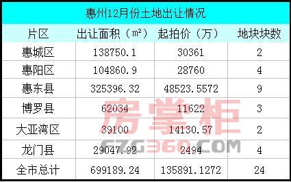 [摘要]历来在年底大量出售地块的惠州,在今年12月迎来一波推地高潮。据房掌柜不完全统计,2016年12月,全市共计有24宗商住地块待售,挂牌总面积接近70万平米,总起拍价达到13.6亿元,这将是惠州土地市场自2014年12月以 ...