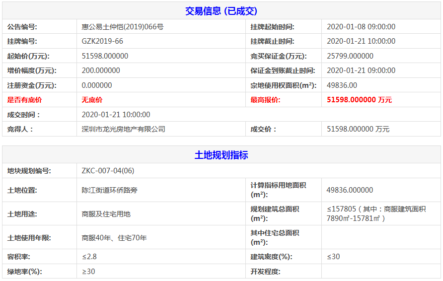 惠州市722亿元出让2宗商住用地 龙光516亿元摘得一宗