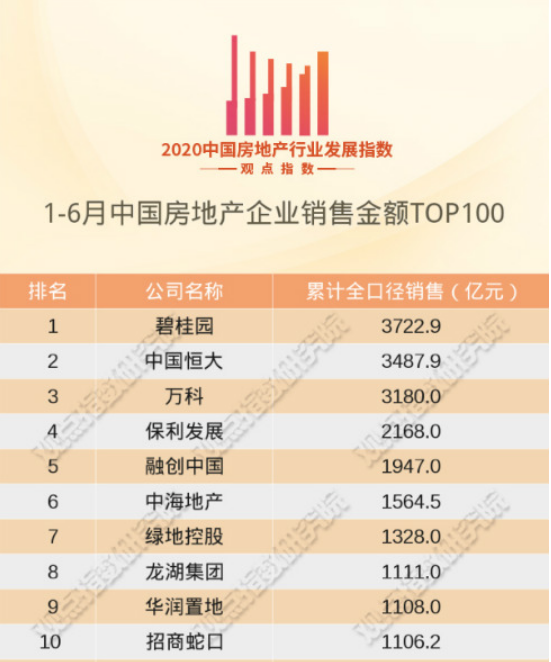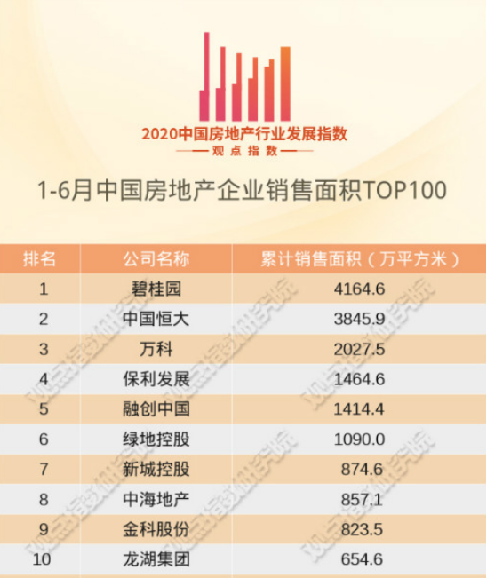 2020年上半年中国房地产企业销售面积TOP100:总录得37659.7万平方米