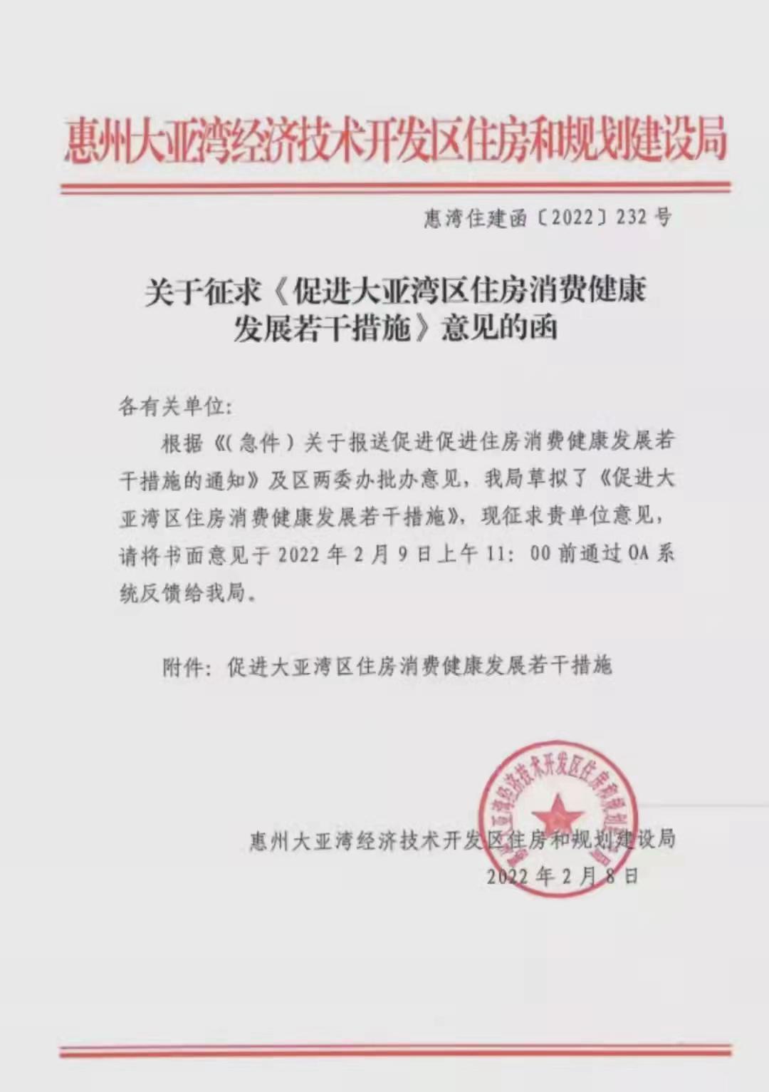 财经网讯 2月10日,一份关于征求《促进大亚湾区住房消费健康发展若干措施》意见的函在网络流传。不过,财经网在惠州市相关政府官网并未检索到该文件。