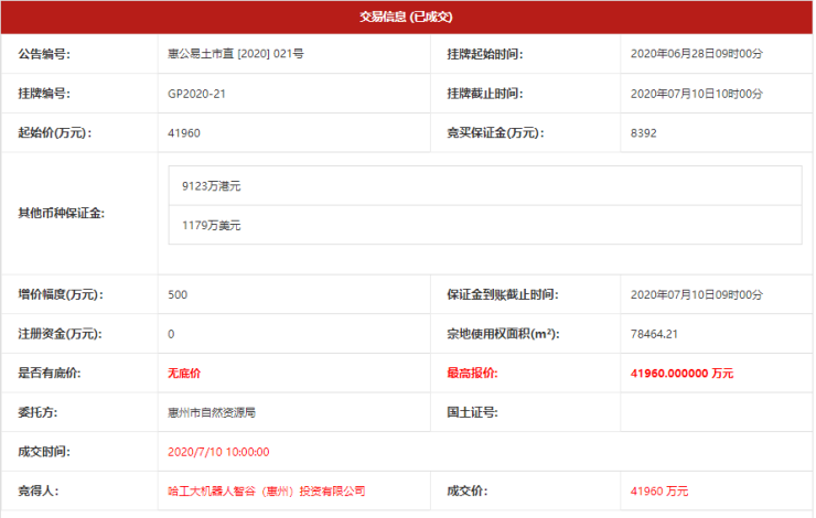 7月10日,位于江南大道一宗9.97万㎡新型产业用地,被哈工大机器人智谷(惠州)投资有限公司以底价4.2亿元竞得,楼面价为1500元/㎡。