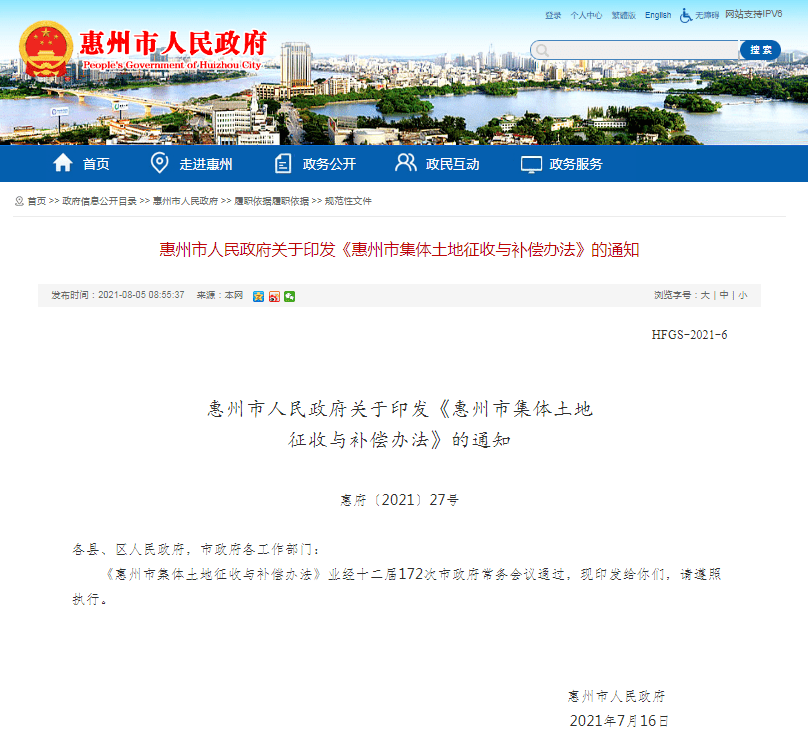 近日,惠州市人民政府印发《惠州市集体土地征收与补偿办法》,对惠州集体土地的征收与补偿制定了新的办法。本办法自2021年8月1日起施行,有效期3年。