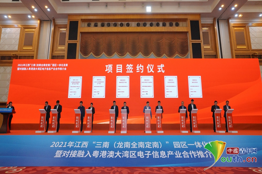 12月17日,赣州市打造对接融入粤港澳大湾区桥头堡暨“粤企入赣”投资合作推介会在深圳举行,现场签约20个项目,签约总金额369亿元。紧随其后,有“桥头堡的桥头堡”之称的“三南”(龙南定南全南),在深圳举行了2021年江西“三南”园区一体化发展暨对接融入粤港澳大湾区电子信息产业合作推介会,共签约19个项目,签约总金额207亿元,创下8年来历史新高。