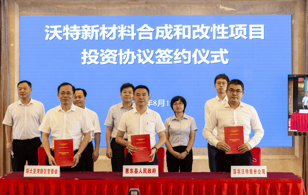 2021年8月13日,沃特股份与惠州新材料产业园规划建设指挥部战略合作签约仪式在惠州市惠州宾馆隆重举行。