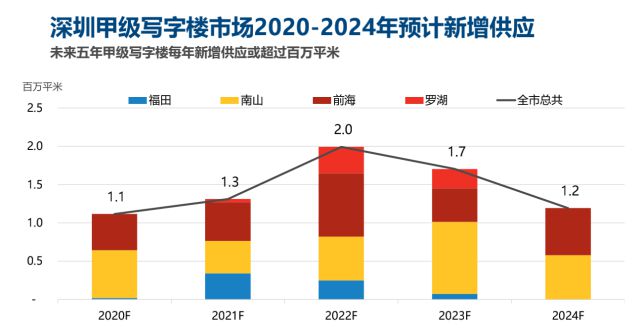 高力国际深圳办公楼服务部副董事刘紫千称,展望2020年,全年计划总共约111.7万平米的全市甲级写字楼供应,相比2019年的约70.7万平米将增长58%。而从2020年到2024年的五年间,总共会有约732万平米的新建甲级写字楼体量入市,且主要集中在南山和前海。“深圳市场还在面临经济增长放缓的挑战,因此预计2020年全市甲级写字楼空置率会继续小幅攀升,而租金表现则相对持平。”