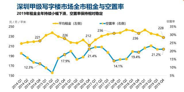 高力国际数据显示,全年深圳甲级写字楼新增供应同比增长12%到约70.7万平方米。相应空置率同比微升1.8百分点到21.2%,导致甲级写字楼租金从236元下降至228元/平方米。