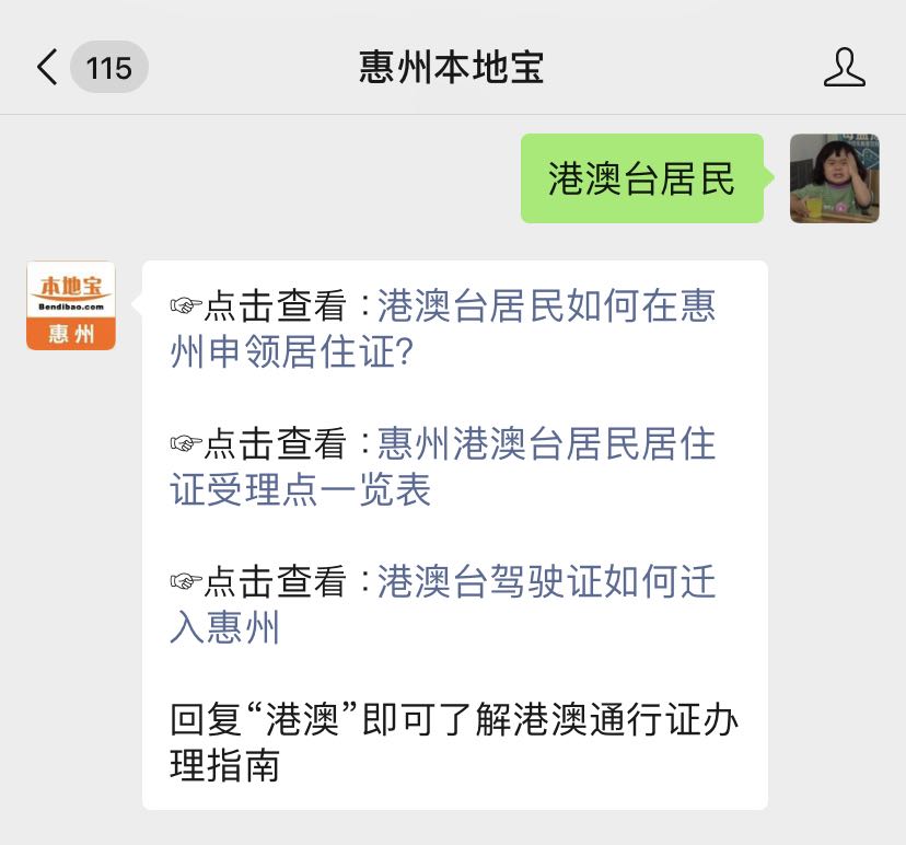 温馨提示:微信搜索公众号惠州本地宝,关注后在对话框回复【港澳台居民】可获得惠州港澳台居民办理居住证指南、地点及详细的方式等等。